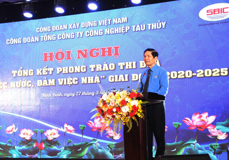 Ông Nguyễn Thanh Tùng – Ủy viên Ban Chấp hành Tổng Liên đoàn Lao động Việt Nam, Phó Chủ tịch Thường trực Công đoàn Xây dựng Việt Nam đã ghi nhận và biểu dương những kết quả nổi bật của phong trào thi đua “Giỏi việc nước, đảm việc nhà” Công đoàn Tổng Công ty Công nghiệp tàu thủy đạt được trong giai đoạn 2020 –2025. Theo đó, trong bối cảnh còn nhiều khó khăn, thách thức của ngành và nền kinh tế, đội ngũ nữ cán bộ, công nhân viên chức, người lao động trong Tổng Công ty đã không ngừng nỗ lực, phát huy tinh thần trách nhiệm, sáng tạo trong lao động sản xuất, từng bước khẳng định vai trò, vị thế của mình. Không chỉ hoàn thành tốt nhiệm vụ chuyên môn, nhiều chị em còn là điểm tựa vững chắc trong gia đình, góp phần xây dựng tổ ấm no ấm, tiến bộ, hạnh phúc. Đồng chí cũng đề nghị trong thời gian tới, Công đoàn Tổng công ty tiếp tục quan tâm, đổi mới nội dung và phương thức tổ chức phong trào thi đua theo hướng thiết thực, hiệu quả, gắn với nhiệm vụ sản xuất kinh doanh của đơn vị. Đồng thời, cần chú trọng công tác đào tạo, bồi dưỡng, tạo điều kiện để nữ lao động nâng cao trình độ chuyên môn, kỹ năng nghề nghiệp; quan tâm chăm lo đời sống vật chất, tinh thần, bảo vệ quyền và lợi ích hợp pháp, chính đáng của lao động nữ.