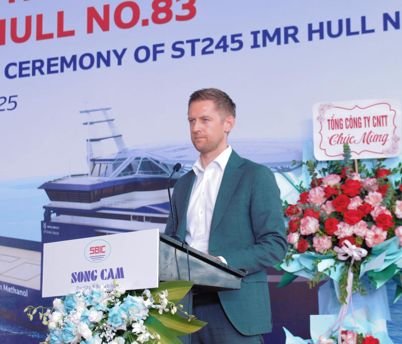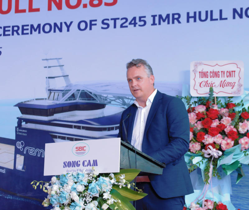 Ông Leiv Sindre Muren - Giám đốc điều hành của Myklebust phát biểu chúc mừng, cảm ơn Công ty Đóng tàu Sông Cấm