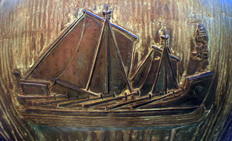Một chiếc thuyền chiến thời Nguyễn trên Cửu đỉnh: Ô Thuyền là loại thuyền đi biển sơn màu đen, cánh buồm cũng đen, có 12 tay chèo. Loại thuyền này vừa có buồm vừa có tay chèo nên tốc độ nhanh, thường trang bị cho quân tuần tiễu dọc bờ biển