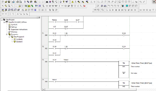 Lập trình: Dựa theo thuật toán Hình 3 có thể lập trình một cách dễ dàng trên các phần mềm của PLC các hãng. Hình 4 thể hiện lập trình trên phần mềm của PLC hãng Omron. Sau khi đã lập trình cho PLC sẽ lập trình giao diện trên HMI.