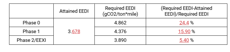 +) Tàu được thiết kế và tính toán tối ưu các yêu tố kỹ thuật liên quan gồm trọng tải tàu, tốc độ tàu cùng hệ công suất máy chính, máy phát đảm bảo yêu cầu thỏa mãn chỉ số hiệu quả năng lượng EEDI phase 2[10] và chỉ số cường độ cac bon CII[11] theo tiêu chuẩn Công ước Quốc tế MARPOL của IMO đảm bảo tính hiệu quả năng lượng và môi trường của tàu. Đây là tàu đầu tiên của Viêt Nam thiết kế đóng mới mang trong nước đạt tiêu chuẩn chỉ số hiệu quả năng lượng EEDI phase 2.