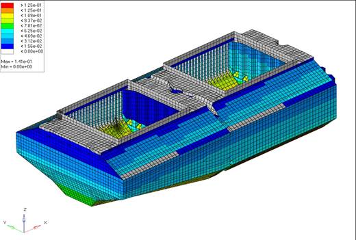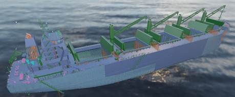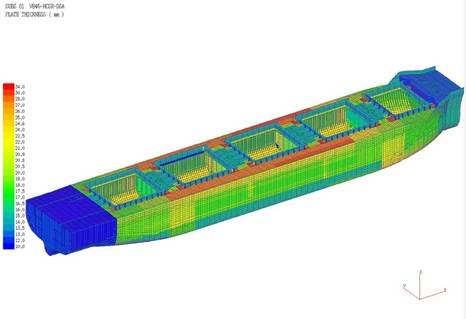 +) Để đảm bảo tối ưu hóa kết cấu thân tàu và tăng tuổi thọ của tàu theo yêu cầu của Tổ chức IMO đối với tàu hàng rời ít nhất 25 năm, tàu được thiết kế tính toán theo quy định mới nhất của Bộ luật Quy phạm chung HCSR[12] của Tổ chức Đăng kiểm Quốc tế IACS, Toàn bộ kết cấu thân tàu được ứng dụng phần mềm chuyên dụng tính toán phần tử hữu hạn để xác định tối ưu hóa kết cấu và đảm bảo độ bền chung, độ bền cụ bộ cũng như độ mỏi của tàu theo quy định của Bộ luật áp dụng cho tàu hàng rời, bên cạnh đó kết cấu tàu được lựa chọn đến 90% loại thép có cường độ cao để đảm bảo khối lượng tàu tối ưu nhằm tăng trọng tải của tàu tối đa chuyên chở.